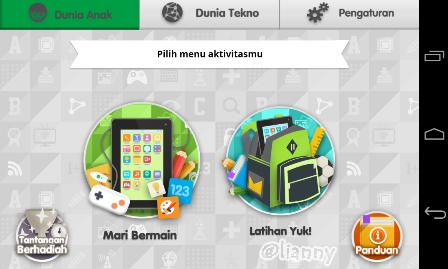 Terdapat 3 bagian fitur utama di home yaitu : Dunia Anak, Dunia Tekno dan Pengaturan. Selain itu ada juga fitur pendukung yaitu Tantangan Berhadiah dan Panduan.