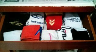 Setelah itu tiap kaos kaki diberi inisial nama biar lebih mudah nyari dan tidak tertukar. Lalu kaos kaki dimasukkan sendiri-sendiri di lemari baju mereka, nggak dijadikan satu lagi. Kebetulan ada satu laci kecil di lemari baju, nah itu yang sekarang dipakai buat nyimpen kaos kaki.
