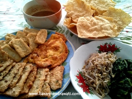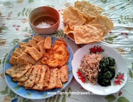Kemarin lusa, jadi juga nyobain sambel pecel dan kerupuknya. Tinggal beli sayur, tahu dan tempe di penjual sayur keliling langgananku. Kebetulan bapak penjual sayurnya membawa daun bawang, jadilah tempenya kubuat jadi tempe mendoan aja. Masak singkat, cuma merebus sayur, dadar telur, menggoreng tahu, tempe, kerupuk dan menyiapkan bumbu pecelnya. Selesai!