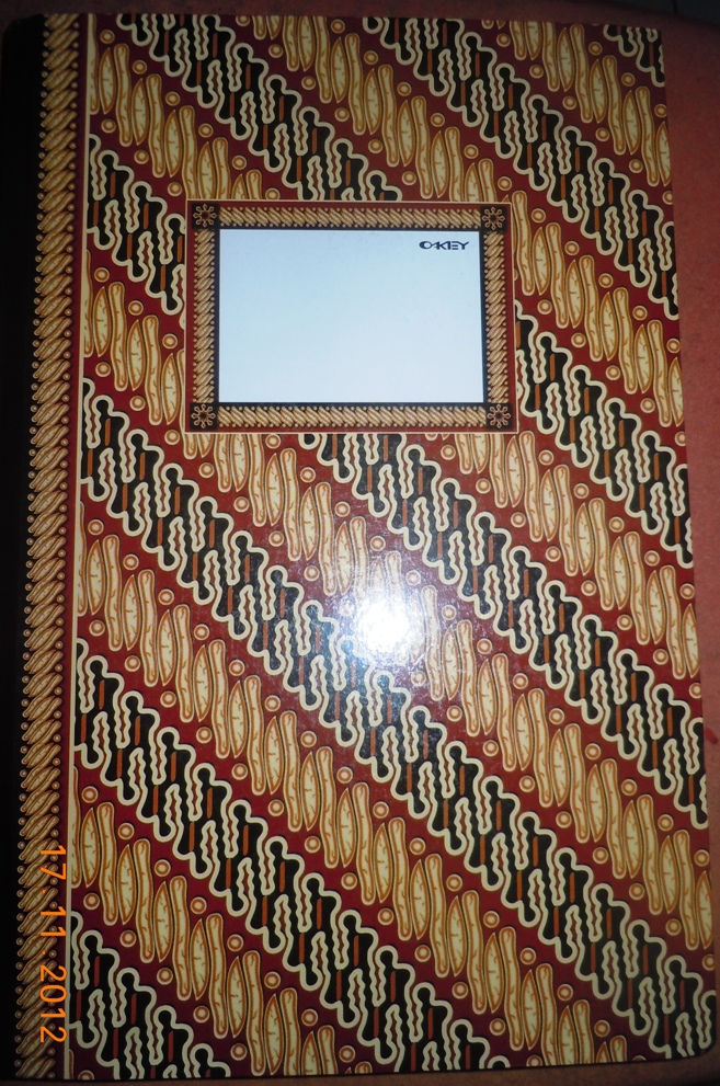 Sebetulnya beragam juga ya kerajinan yang bisa memanfaatkan batik ini. Memang batik sekarang lagi ngetren banget. Saat aku membeli buku tulis untuk pelajaran akuntansi -nya anakku yang masuk smp, buku besar yang biasanya covernya itu kotak-kotak … eh ini ada yang covernya batik. Langsung saja aku beli yang cover batik, jarang-jarang lho ada. Bagus sekali kelihatannya. Nih dia bukunya: