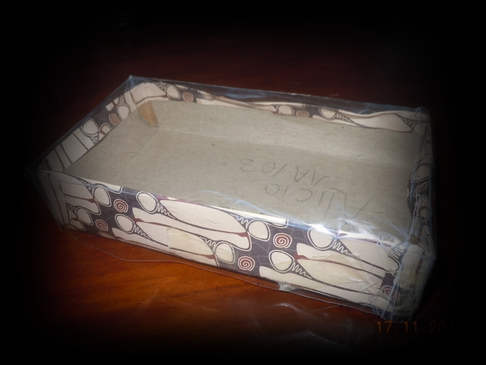Membuat kotak kecil sederhana memakai karton yang dihias dengan kertas bercorak batik. Penutup atasnya memakai mika bening. Eh.. kotaknya sebenernya buat apa sih nak..? Ah.. buat apa saja boleh kok, sekarang malah dijadikan tempat menaruh karet rambutnya di situ, ada manfaatnya juga ternyata … Ini dia kotak kecil bercorak batik :