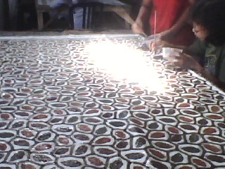 2. Langkah kedua, motif digambar sesuai keinginan di atas kertas karkir. Lalu kertas karkir diletakkan di bawah kain Batik dan motif itu dijiplak di atas kain batik. Menggambar motif menggunakan pensil 6B sehingga motif dapat terlihat jelas.