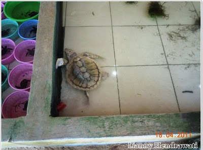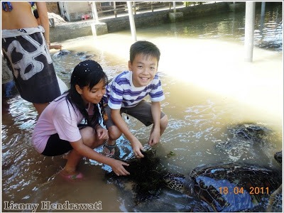Ternyata induk penyu yang badannya besar itu umurnya ada yang hampir 100 tahun lho. Nah, jadi keingat film-film di televisi yang orangnya bisa duduk di punggung penyu raksasa he he .. Penyu ini makanannya rumput laut, tidak menggigit. Anak-anak saling berebut mencoba memberi makan induk penyu itu dengan rumput laut yang disediakan, meski dengan agak takut-takut karena badan penyunya besar sekali hihi 🙂