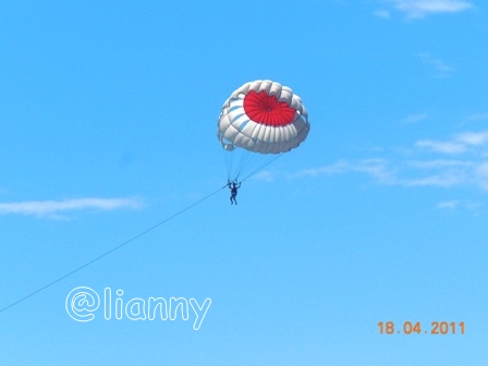 Sebetulnya aku enggan juga mencoba parasailing, ih suami merayu-rayu, ayo coba sekali aja, katanya. Yah akhirnya dengan amat terpaksa, aku mencoba juga parasailing itu. Dan bukannya menikmati keindahan laut dari atas, aku malah sibuk berdoa saat tubuhku “terbang” di atas sana. Hiiyy takut banget deh, apalagi saat tubuhku seharusnya sudah perlahan-lahan mendarat, eh kok nggak turun-turun yahh. Ternyata oh ternyata … aku baru ingat kalau sudah waktunya turun itu, aku harus menarik tali yang kupegang ke bawah. Cepat-cepat kutarik talinya dan akhirnya tubuhnya bisa mendarat juga di tanah *tarik napas lega, elap keringet. Fiuuhh sekali itu saja deh aku mau nyoba parasailing, nggak bakalan mau nyoba lagi, benar-benar sport jantung. Dan ternyata suamiku juga sama, nggak mau nyoba lagi hahaha.. *Tapi klo orang yang suka tantangan seperti ini, mau berkali-kali juga nggak akan kapok, malah enjoy dan menikmati saja 🙂 Buatku ngeri banget pokoknya, apalagi saat perjalanan ke Pulau Penyu, bapak yang mengantarkan kami itu bercerita kalau ada yang naik parasailing terus terjadi kecelakaan, anginnya terlalu kencang dan orang itu nyangkut di pohon dan bagian tubuh belakangnya hancur. Haduhhh amit-amit deh huhuhu… benar-benar kami mengucap syukur berkali-kali dalam hati karena bisa mendarat dengan mulus saat itu.