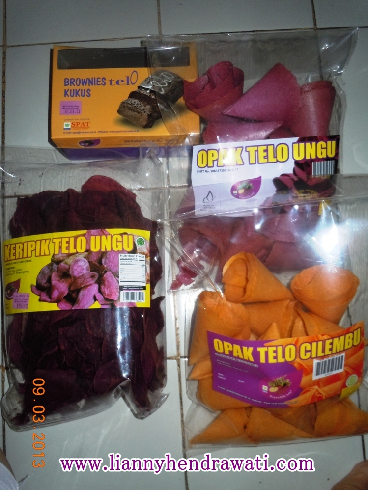Saat masuk ke dalam ruangan, pandangan mataku langsung terfokus pada berbagai makanan yang dipajang di situ. Uniknya semua makanan itu ternyata berasal dari bahan dasar Telo atau ubi jalar dengan penyajian yang bervariasi dan mengundang selera untuk mencobanya. Telo yang biasanya dikenal sebagai makanan orang desa dengan penyajian yang sangat sederhana yaitu dikukus atau digoreng, tak nampak di situ. Sebagai gantinya telo itu diolah menjadi beragam jenis makanan seperti : Brownies Telo kukus, Nugget Telo, Pizza Telo, Ice Cream Telo, Sandwich-hotdog Telo, Bakpao telo dan masih banyak lagi. Beragam jenis kue basah juga ada seperti : ke donat, kue lumpur, kue mangkok dan masih banyak lagi.