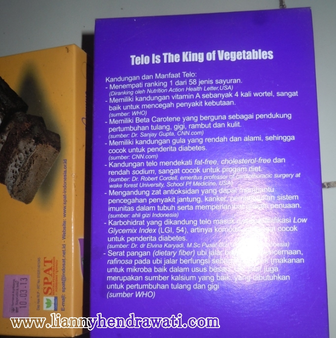 O ya di belakang kardus Brownies Kukus Telo itu terdapat uraian tentang kandungan dan manfaat dari si telo, ini dia tulisannya: