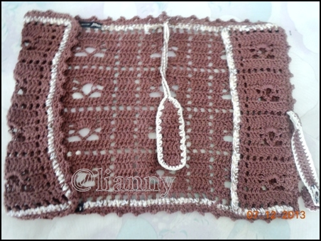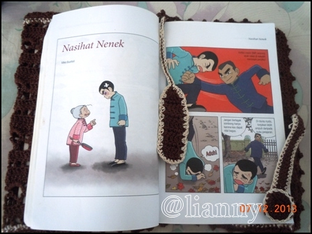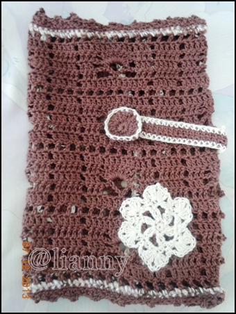 Hadiah yang kudapat adalah pulsa 15 ribu dan sambul buku rajut ( percaya deh ini dirajut sendiri oleh mb. Na dengan penuh cinta *ehem 😀 ).  Beberapa hari setelah pengumuman, pak pos datang bawa paketan, ternyata hadiah dari mb. Na. Dan begitu dibuka, muncullah sebuah sambul buku rajut berwarna cokelat berhias bunga putih, wah cantik banget. Dan yang tidak menyangka itu, didalam sampul buku itu sudah ada pembatas bukunya juga, yang melekat dengan bagian atasnya, jadi tidak mungkin hilang. Salut deh, kok kepikiran bikin pembatas bukunya itu lho, kreatif banget ya.