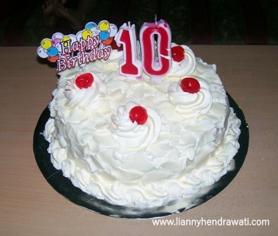 Nah, saat ulang tahun yang ke 10, si sulung minta kue tart yang memakai cokelat putih. Adik-adiknya sudah protes, nggak mau kalau pakai cokelat putih. Jadi bingung kan pilih kue tartnya. Tapi kupikir, kan ini ultah si sulung, jadi nggak apa-apa deh nurutin permintaannya sebagai hadiah ultah. Nanti klo adiknya yang ultah biar mereka juga pilih sendiri kue tart yang mereka mau. Dan, akhirnya jadi beli kue tart berbalut cokelat putih dong. Tetap aja, setelah kue tart dipotong, akhirnya ludes juga hehehe πŸ˜€ Giliran adiknya yang ultah, adiknya milih kue tart black forest.
